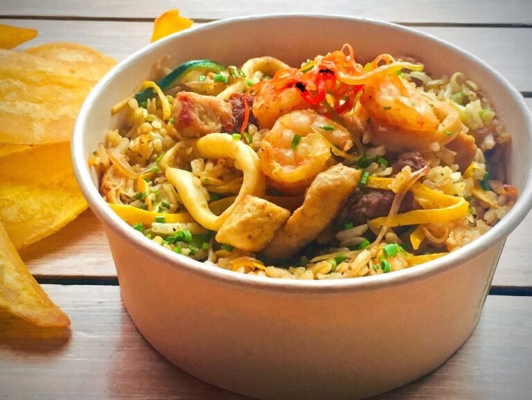 Arroz con surtido de mariscos y carne de res salteados en salsa criolla con especias